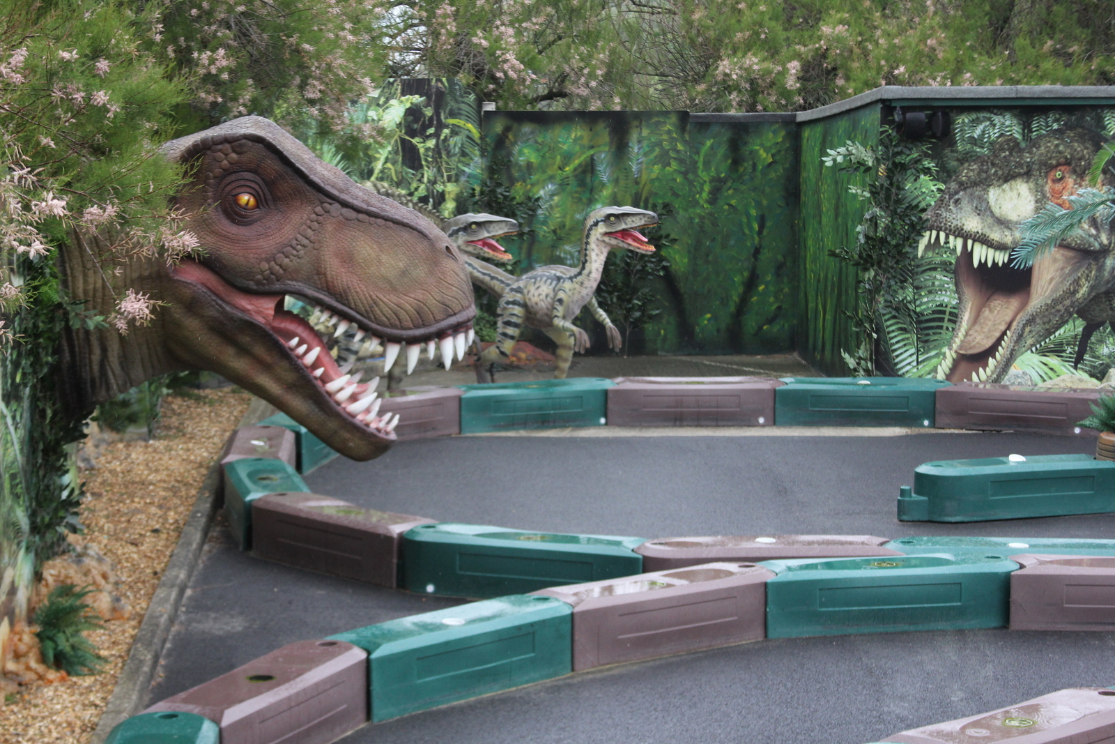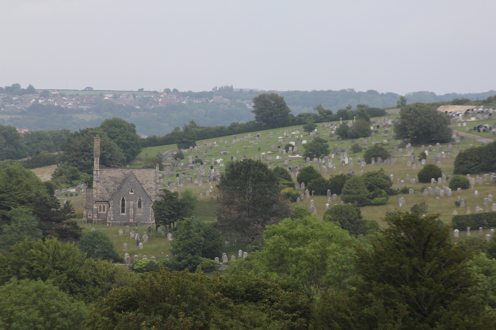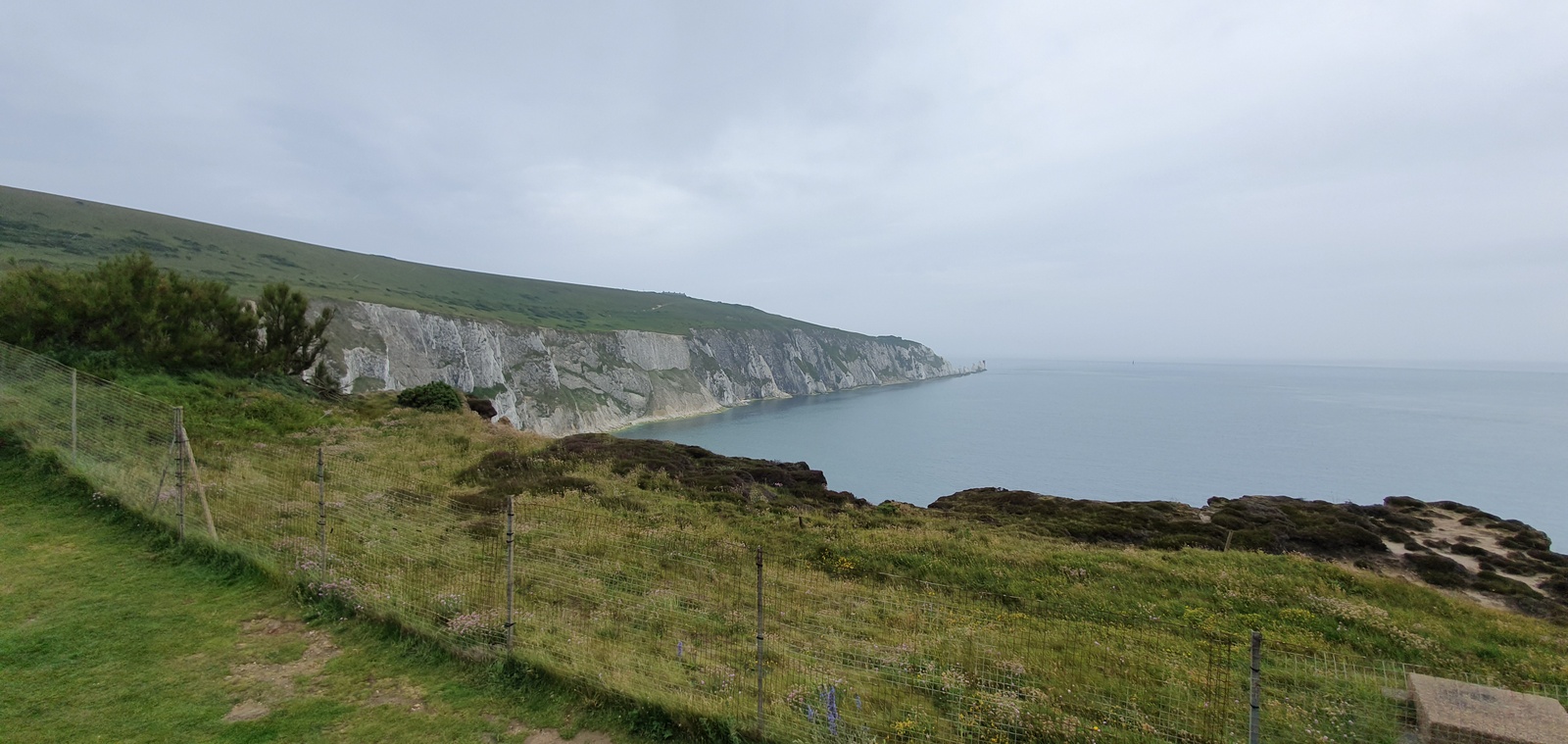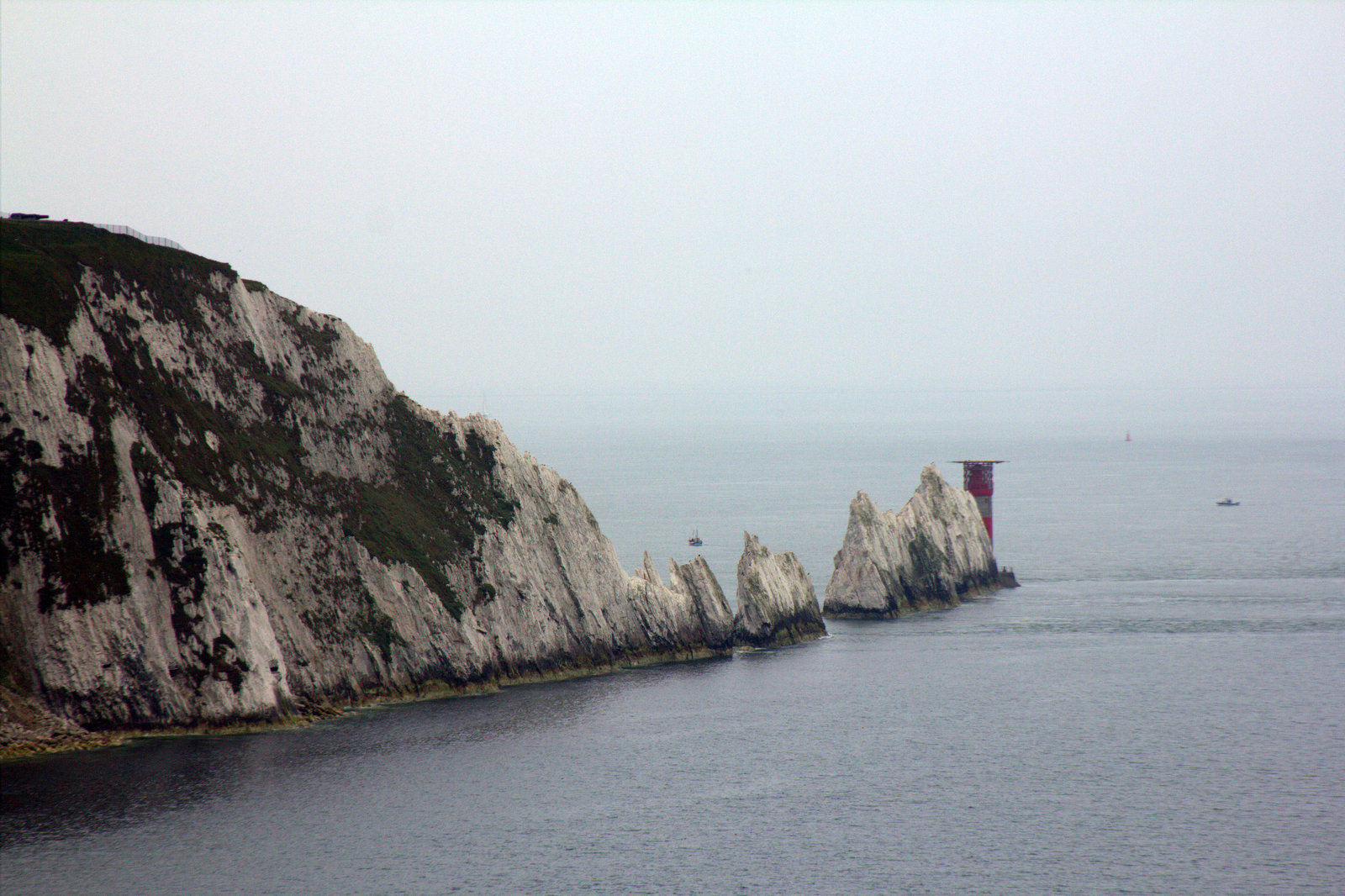 Das Wetter ist grau mit einem sporadischen, warmen Nieselregen. Eigentlich ganz angenehm. Nur nicht so gut um Fotos zu machen. Unsere erste Station sind die Needles im Westen der Insel. Eine Reihe von Kreidekegeln, die wirklich nicht wie Nadeln aussehen, und von einem Leuchtfeuer in ähnlicher Größe abgeschlossen werden. Es gibt einen Aussichtspunkt, der Teil von einem Kindervergnügungspark ist, der ein Dinosaurier-Theme hat. Wegen des Wetters ist aber nicht viel los. Hier steht auch ein Stein, der den Standplatz einer Radiostation markiert, von der aus Marconi die ersten Funkverbindungen zu Schiffen auf See getestet hat.