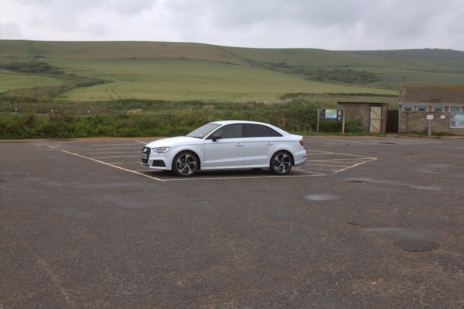 Auch an der Südküste gibt es eine braune Variante der „White Cliffs of Dover“, nur nicht so hoch. Die Erde bricht hier in das Wasser des Ärmelkanals und wird vermutlich irgendwann die Wanderwege und später vielleicht auch die Küstenstraße mitreißen. Noch ist die Gegend hier aber sehr hübsch und grün und nur spärlich besiedelt. Die Besiedlung nimmt aber zu je weiter wir nach Osten kommen. Da ich hier den mal nicht den Navigationscomputer verwende, geraten wir in eine kleine Dorfstraße, die so schmal ist, dass ich mit den linken Reifen über den Bürgersteig fahren muss um an den parkenden Autos vorbei zu kommen. Eine eigenwillige Form der Straßenberuhigung.