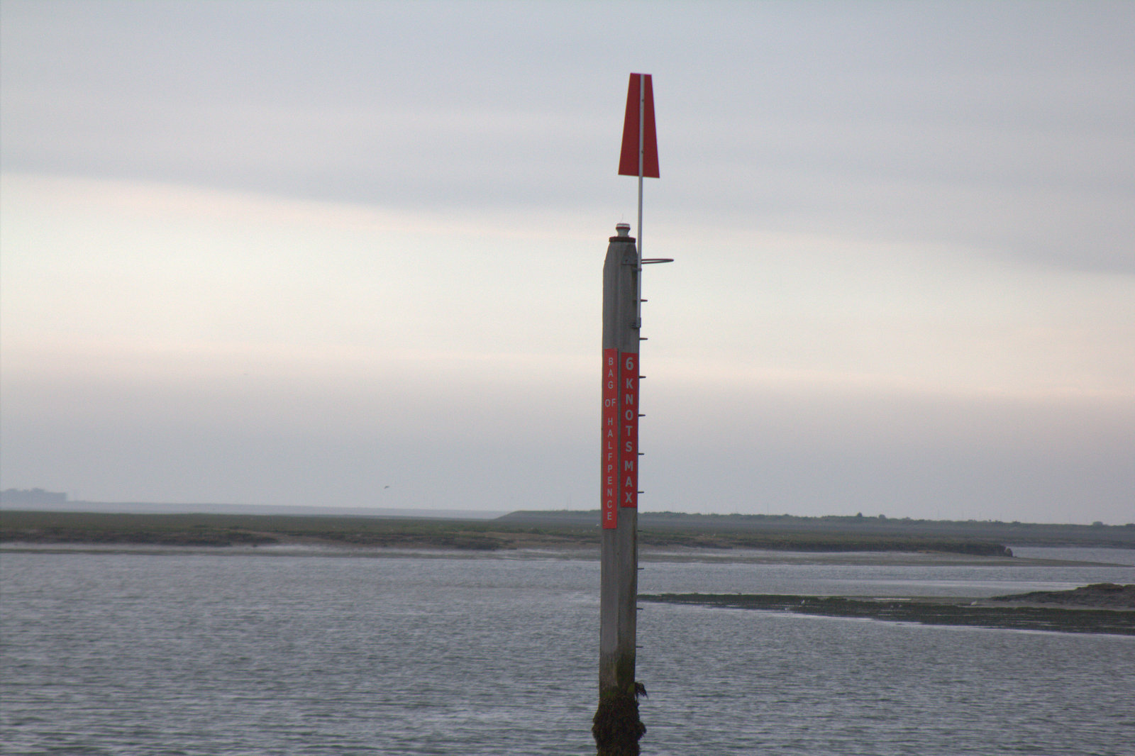 Als wir schon fast wieder in Lymington sind, fallen mir die Beschriftungen der Barken auf, die die Fahrrinne markieren. Auf einer Seite steht sowas wie „Max 6 Feet Deep“ aber auf der anderen Seite ist in der gleichen Schrift eine wenig maritime Phrase abgebildet wie z.B. „Bag of Halfpence“. Was hat es wohl damit auf sich?