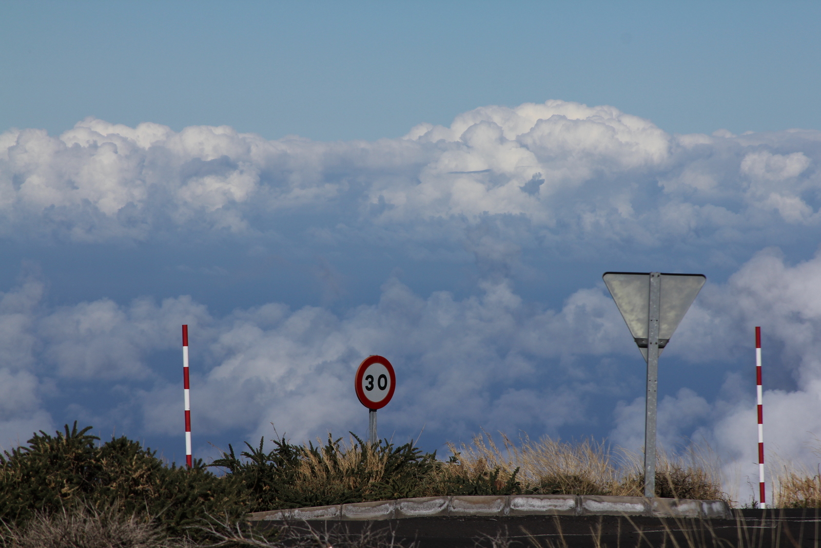 Der Weg hierher führt mal wieder durch viele Kurven und immer kleiner werdende Straßen.  Ich schaffe die 40 km in etwas mehr als einer Stunde.  Hinter jeder Ecke wechselt das Wetter.  Beim Hotel ist es grau und regnerisch.  Auf dem Weg regnet es mal, dann scheint die Sonne.  Ich sehe einen Regenbogen.  Und dann wieder von vorne.  Aber als ich dann auf den Zubringer zum Observatorium abbiege, wird das Wetter dauerhaft besser.  Bald bin ich über den Wolken und die Sonne scheint wieder wie im Sommer.  Die Luft ist aber angenehm kühl.  Eben wie im Hochgebirge.