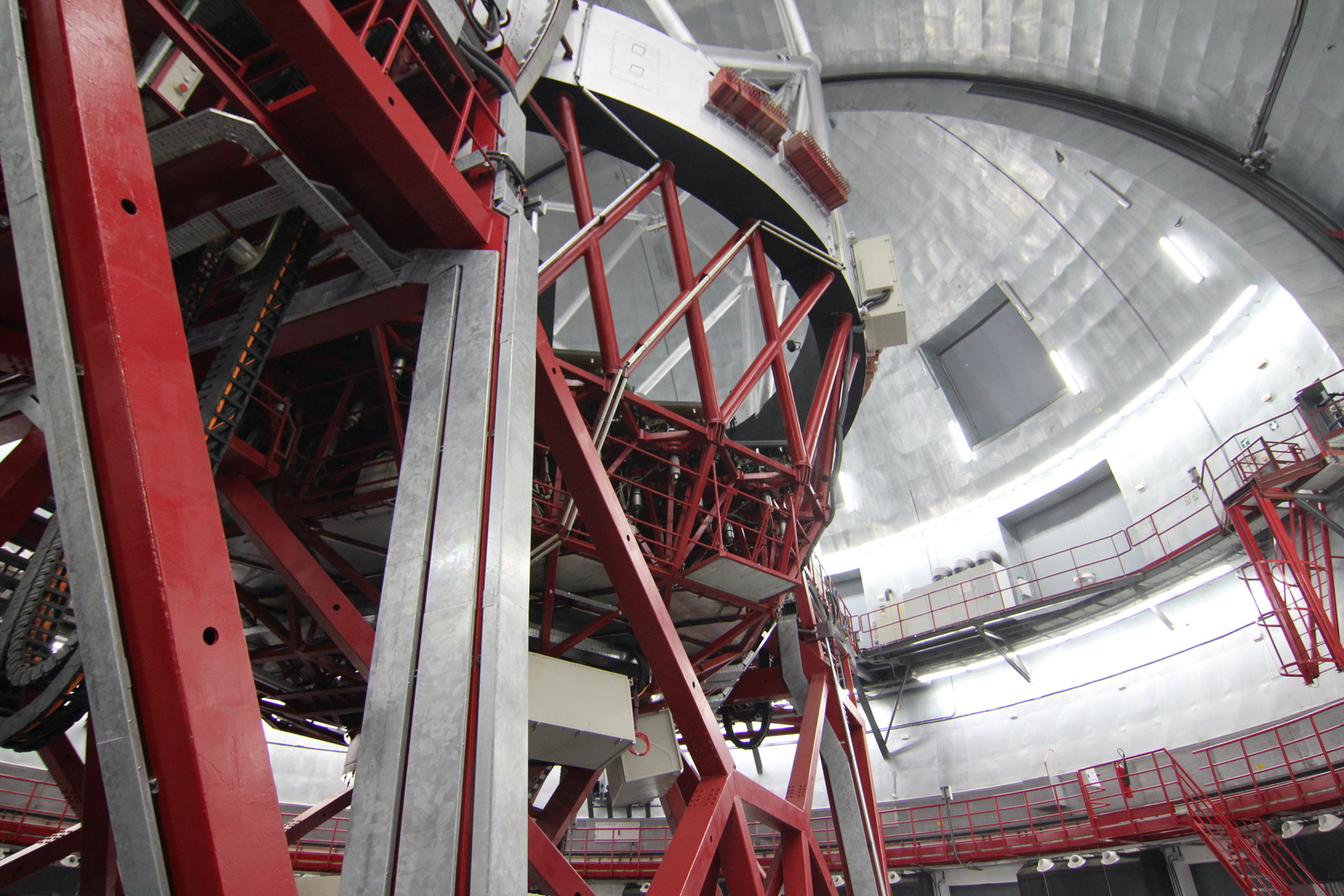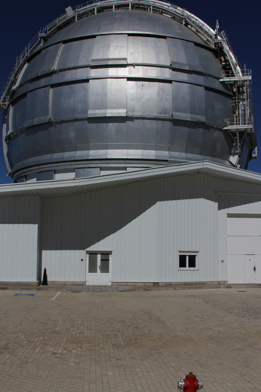Dann fahren wir im Konvoi zur größten Kugel, die hier auf dem Berg steht.  Dem Gran Telescopio Canarias.  Das hat den zur Zeit größten Spiegel der im sichtbaren Spektrum arbeitet.  Er besteht aus etwa 36 sechseckigen Teilspiegeln.  Währe es eine kreisrunde Fläche, dann hätte sie einen Durchmesser von 10,4 Meter.  Im Gegensatz zu der Besichtigung auf Teneriffa, können wir hier wirklich in die Kuppel hinein und uns das Teleskop direkt anschauen.  Ich laufe also auf 2400 Meter Höhe mit blauem Schutzhelm durch eines der wichtigsten und teuersten Observatorium das Menschen gebaut haben.  Hier auf La Palma, auf diesem Berg, gibt es angeblich die besten Bedingungen für optische Teleskope auf diesem Planeten.  Besser als auf Teneriffa und Hawaii und Chile.  Bis auf letzteres, habe ich alle schon gesehen.