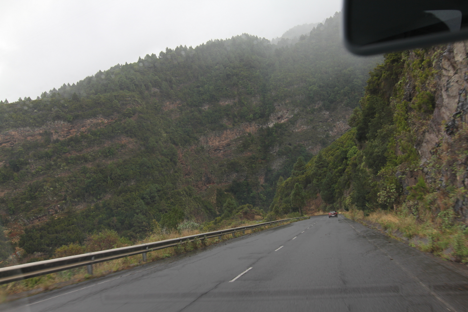 Danach geht es wieder hinab, zurück in den Dauerregen beim Hotel.  Wenn man auf dieser Insel lebt, muss man lernen, Wettervorhersagen zu interpretieren.  Jedes Tal hat hier sein eigenes Mikroklima.  Das Wetter und die Temperaturen können sich komplett ändern, wenn man drei Kilometer mit dem Auto fährt.