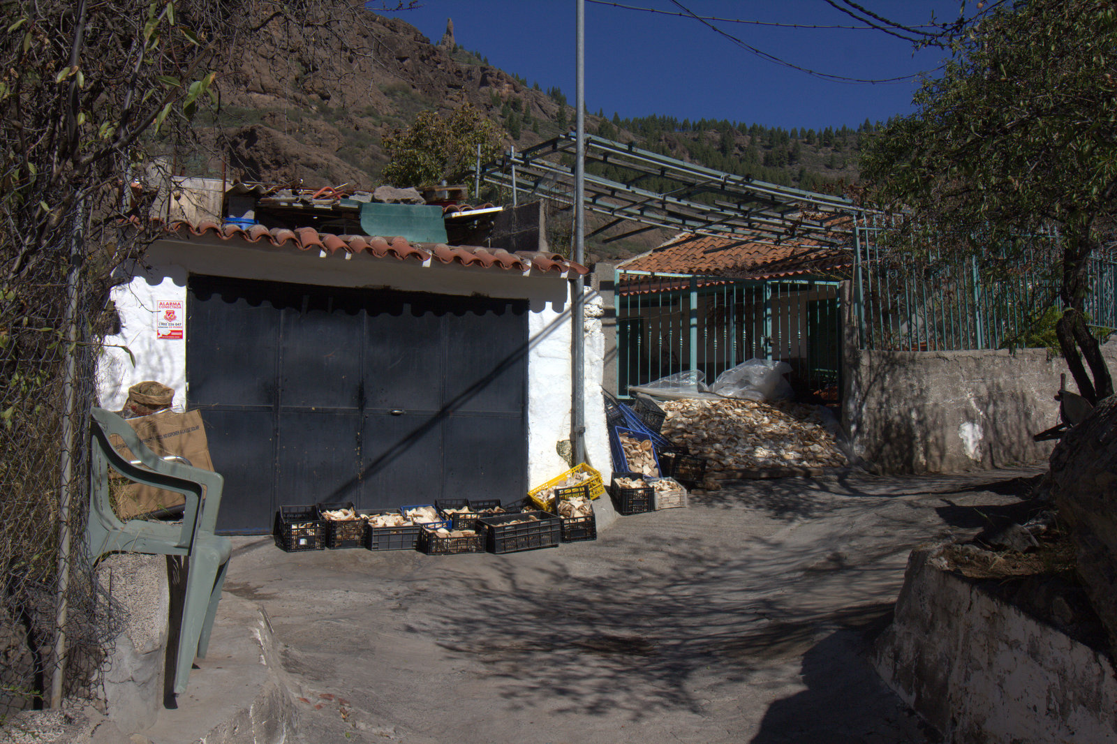 Ich komme etwa um 10 Uhr an.  Händler bauen gerade ihre Stände auf und verkaufen … Pullover.  Seltsam, so kalt ist es auch hier oben nicht. Auf einer Tafel, die über die lokalen Wanderwege informiert, ist der englische Teil mit „Hiking in Teror“ überschrieben.  Nein, da fehlt kein R. Teror ist der Name einer nahegelegenen Stadt.