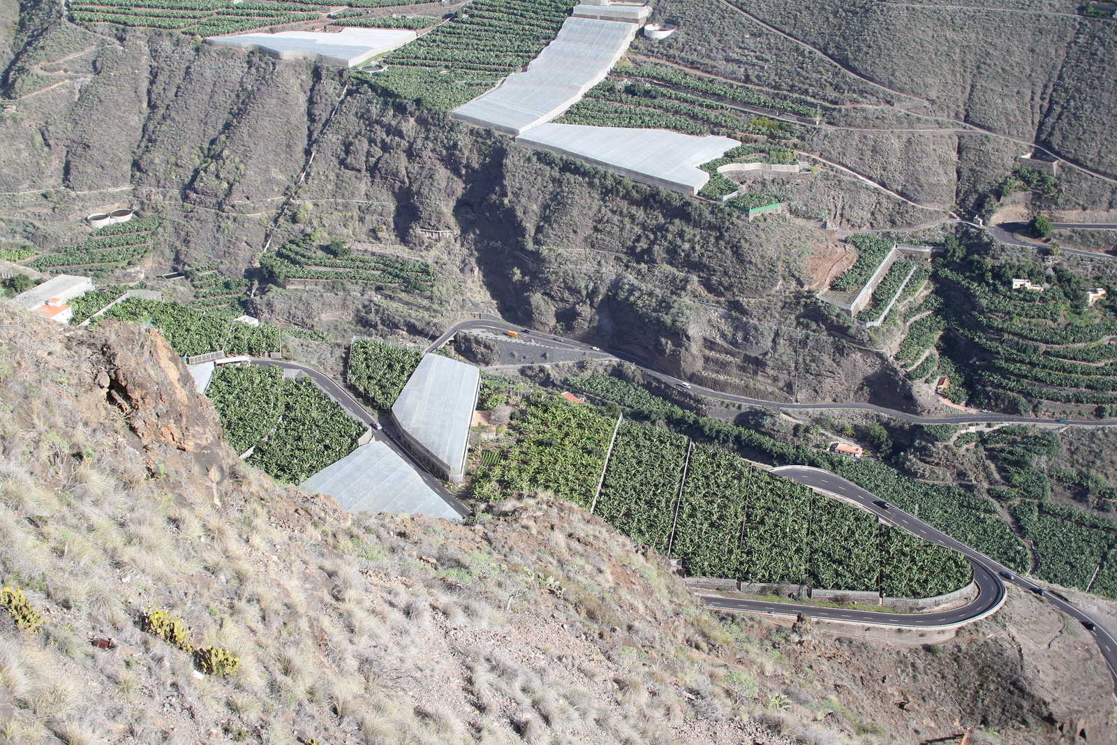 Ich komme an einen Aussichtspunkt, wo ich die Zugangsstraße sehen kann, die in den Barranco del Agua hineinführt. Zum Visitor-Center in Los Tilos, wo ich vorgestern ja schon war. Ich kann auch die alte Straße sehen, wo früher wohl der Barranco umfahren wurde, so wie heute noch all die anderen. Nur dieser eine wird aber heutzutage durch eine Brücke abgekürzt. Der Ausblick alleine ist schon diese Wanderung wert.