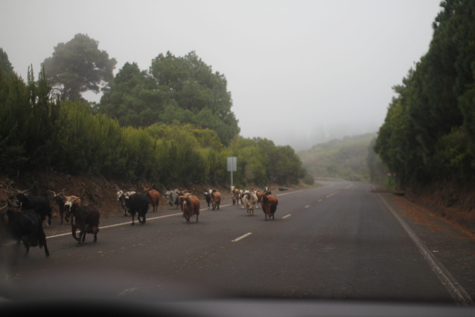 Ich komme schließlich im Tal an und muss feststellen, dass dies der typische Weg durch einen Barranco ist. Also zuerst steil runter und dann auf der anderen Seite wieder steil nach oben. Oben bin ich schon fast in Las Sauces. Einer der grösseren Orte hier im Nordosten. Vielleicht 5000 Einwohner? Von hier an geht es hinauf und zurück. Und der Weg wird schöner. Denn es geht in Richtung Barranco del Agua. Das ist das Tal, wo ich vor ein paar Tagen schon zwei schönen Wanderungen gemacht habe, und das wirklich atemberaubend aussieht. Wenn man es denn sehen kann. Das Wetter ist etwas besser als bei meinem letzten Versuch, diese Wanderung zu machen. An der Küste ist es immer wieder sonnig. In den Bergen neblig mit Nieselregen. Ist aber ganz erfrischen so.