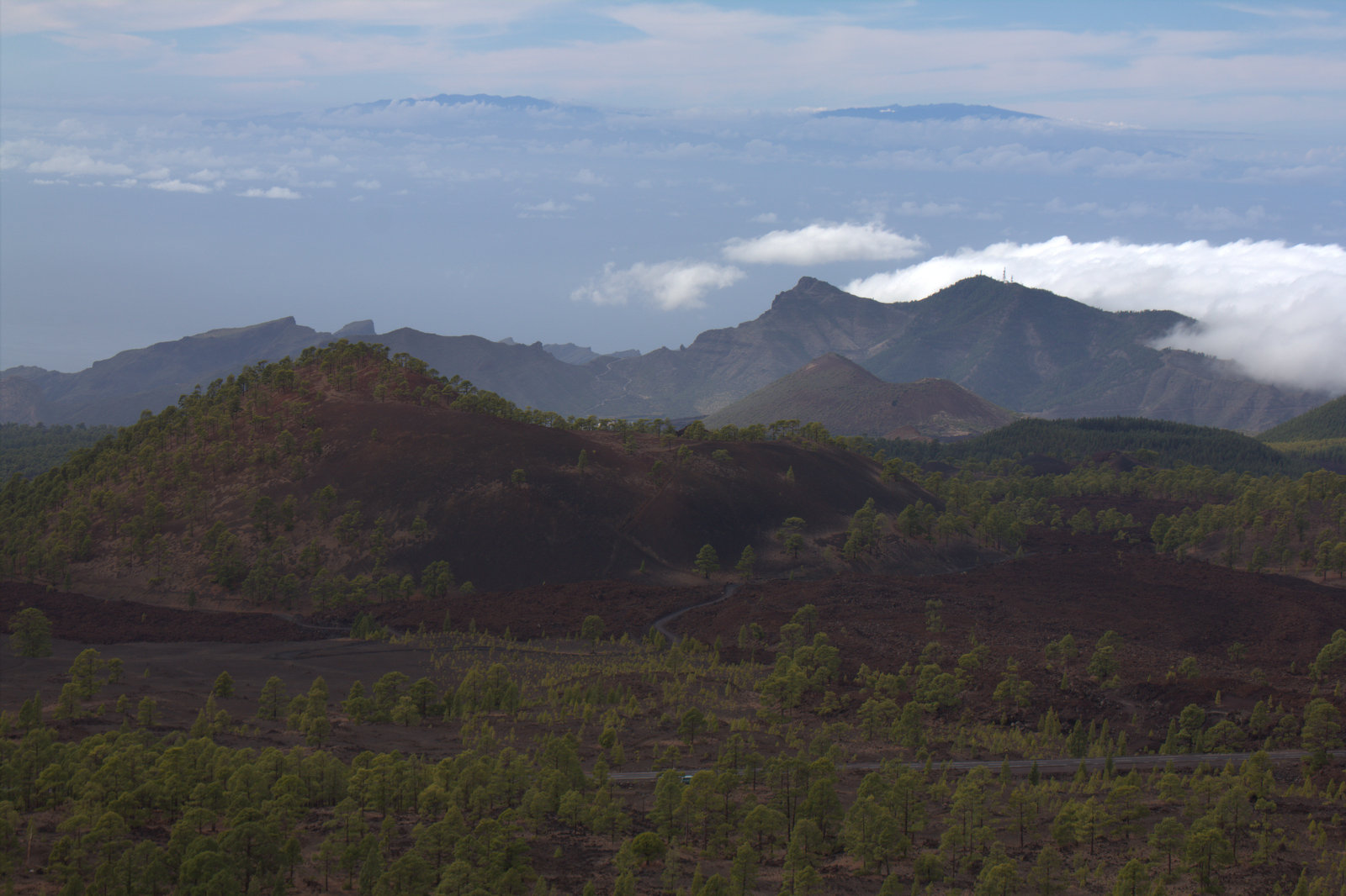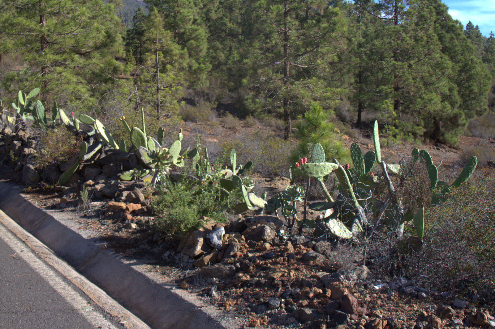 Das Wetter ist heute sehr klar und sonnig. Allerdings nur hier oben. Unten an der Küste ist es diesig bis wolkig. Das gute Wetter lockt heute mehr Touristen an, als gestern. Manche parken sehr eigenwillig, um es höflich auszudrücken. Ich halte kurz bei den Roques de Garcia an um den blauen Himmel für ein paar Fotos auszunutzen. Ist wohl einer der bekannteren Punkte des Tals. Hier halten sogar Busse. Es gibt einen kurzen Weg zu einem Aussichtspunkt, der aber steil über Felsen nach oben führt. Eine junge Frau ist in violetten Flip-Flops unterwegs und wird von einem anderen Touristen mit den Worten „I like your hiking boots“ gelobt. Von einem Nordamerikaner in Straßenschuhen.