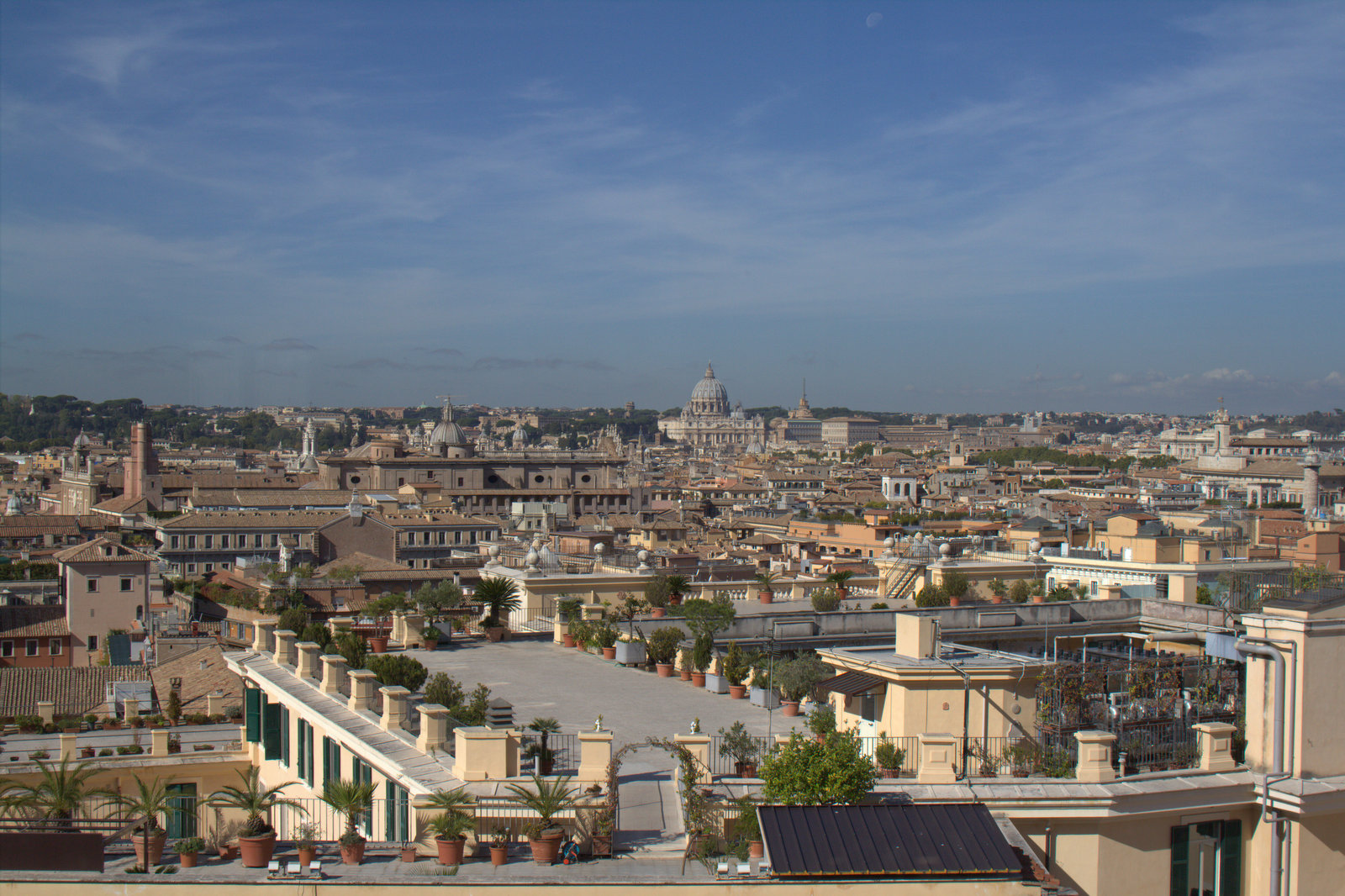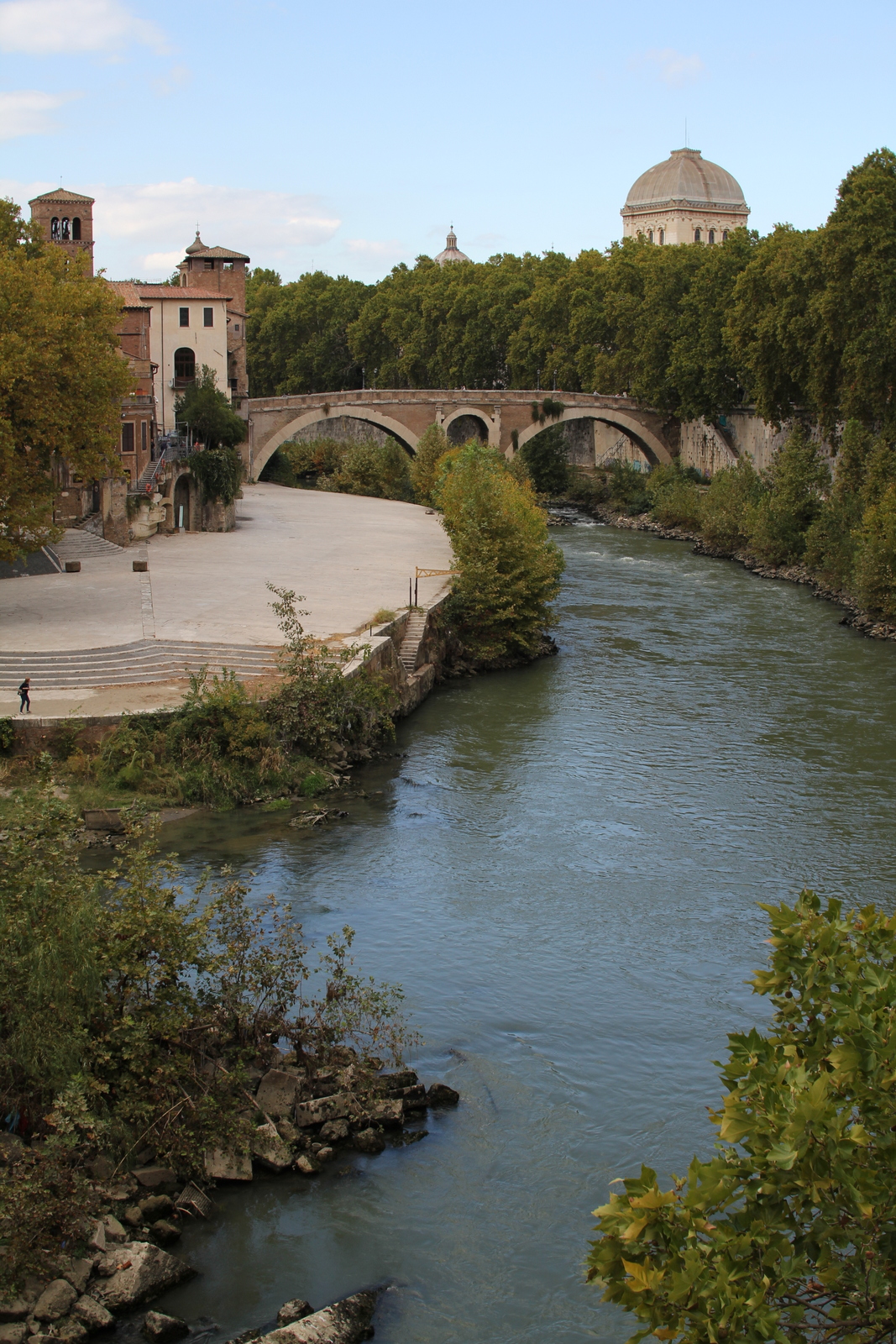 Das Hotel, Hotel Genova, liegt günstig und ist etwas luxuriöser als das in Florenz. Ein paar Minuten zum Bahnhof, etwa 10 zum Kolosseum und Forum Romanum. Ich mache mich mit der Stadt durch einen Spaziergang vertraut. Der wird aber irgendwann zu einer Wanderung, die fast fünf Stunden dauert. Vom Hotel zwischen Kolosseum und dem Forum hindurch. Den Circus Maximus lasse ich links liegen (wörtlich) und überquere den Tiber über die Ponte Palatino, südlich der Tiberinsel. Hier gibt es die Reste einer älteren Brücke. Die Ansicht erinnert mich an die deutsche Romantik. Weiter geht es am Tiber entlang nach Norden zum Vatikan. Den Petersdom erinnere ich auch größer. Allerdings komme ich auch nicht sehr nah ran. Dazu müsste ich mich in eine lange Schlange stellen. An einem der nächsten Tage. An der Engelsburg geht es zurück über den Tiber über die Ponte Sant’Angelo. Dann zum Piazza Navona und zum Pantheon. Dort esse ich eine Kleinigkeit und mache mich auf den Rückweg zum Hotel. Der führt mich am Kapitol und der Trajanssäule vorbei.