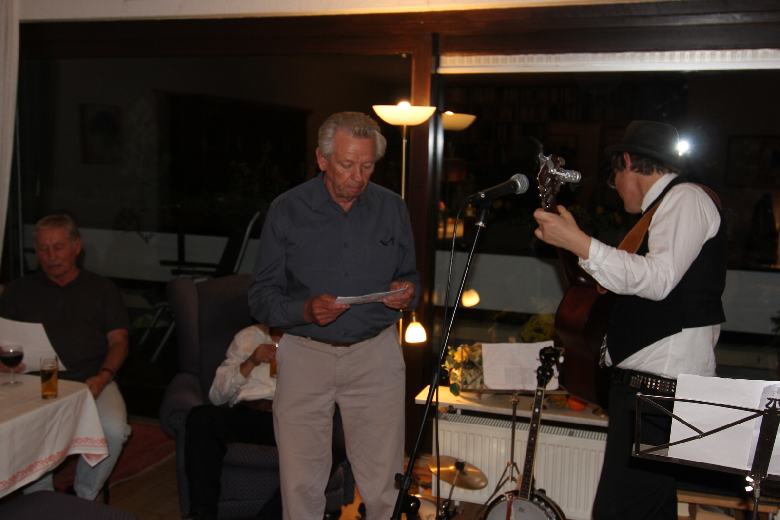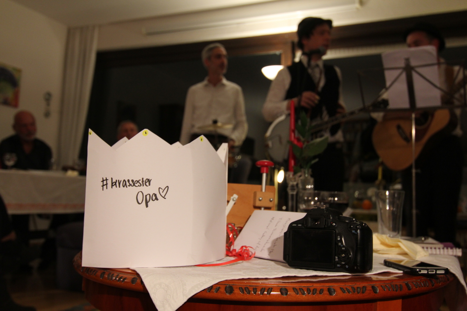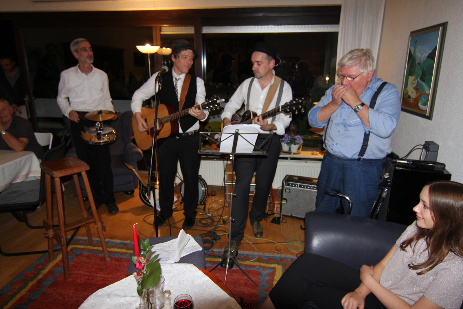 Etwas später kommen die ersten Gäste und die Feier geht los. Es gibt ein paar Reden, dann machen Tim und Band tolle Musik mit Banjo und Nicht-Ukulele (sie hat acht statt vier Saiten). Emilia singt, Peter spielt Mundharmonika.