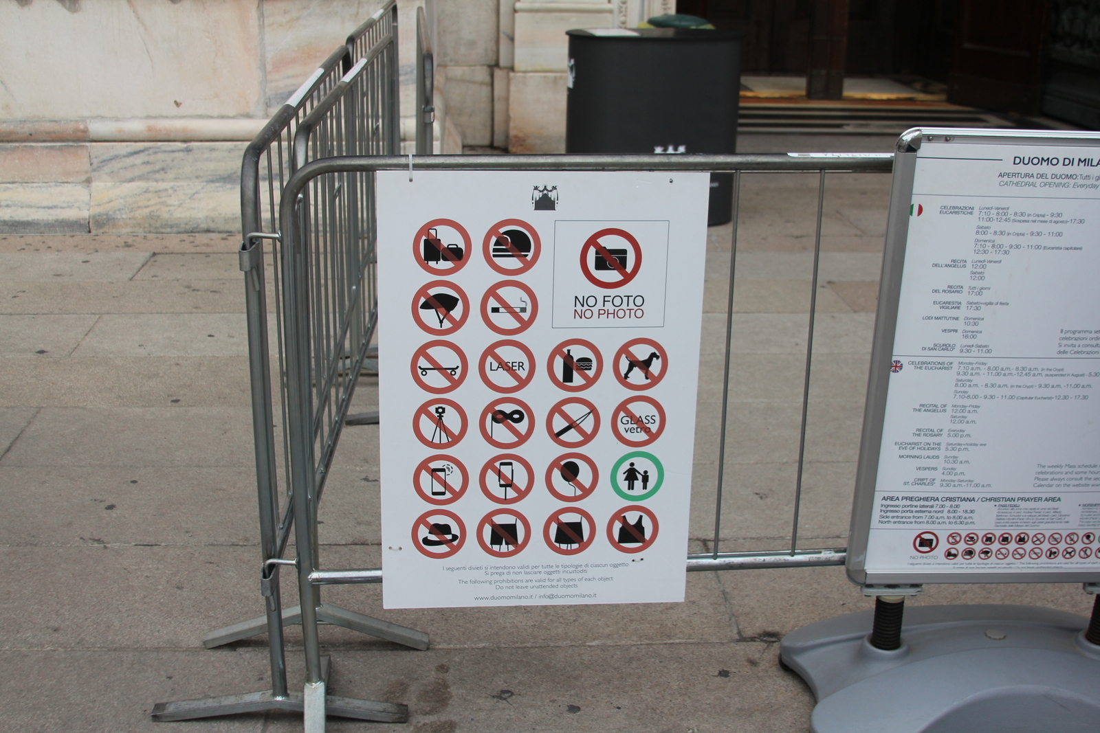 Dann geht es zum Duomo, dem Mailänder Dom. Als ich ankomme, ist eine Feier der Polizei im Gange. Es scheint hier mehr Sorten Polizei als in anderen Ländern Sorten Käse zu geben. Es gibt Reden von Männern in Unformen, die direkt aus einer Oper zu stammen scheinen (die Uniformen). Man kann den Dom dennoch besichtigen. Doch dazu komme ich nicht. Wenn man eine Eintrittskarte kaufen möchte, kann man sich entweder in eine Schlange für vier Automaten stellen. Oder kann eine Marke ziehen und warten bis es aufgerufen wird. Beides dauert angeblich etwa gleich lang. Also nehme ich eine Marke und nutze die, angebliche halbe Stunde, um den Dom von außen zu fotografieren. Als ich wieder da bin, ist meine Nummer schon vorbei. Also stelle ich mich für die Automaten an. Das geht viel schneller. Nach wenigen Minuten bin ich dran. Allerdings wird meine Kreditkarte ohne Angabe eines Grundes abgewiesen. Da niemand da ist, der Helfen könnte und der Automat kein Bargeld nimmt, entscheide ich mich, den Besuch des Doms zu überspringen.