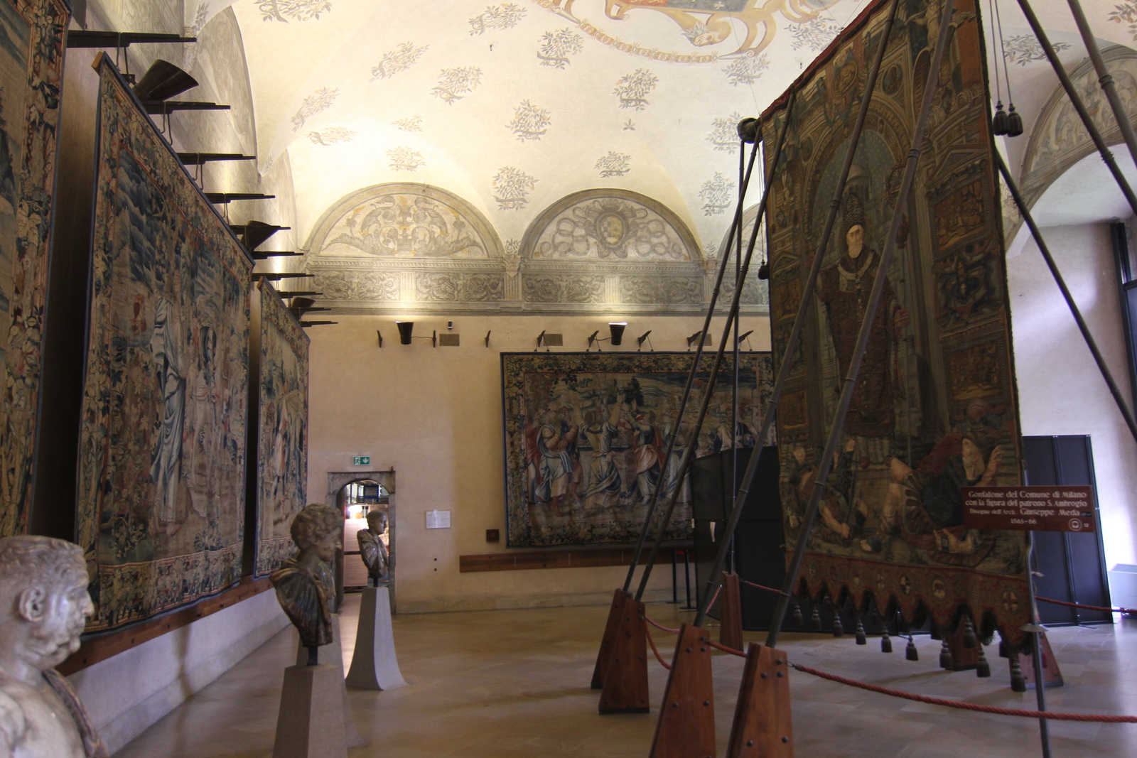 In dieser Festung, die auch ein Schloß ist, wird mir klar, wie viel Reichtum es damals in Mailand gegeben haben muß, der es erlaubt hat, eine solche  Festung zubauen, in der es so viele große und großzügige und prächtige Räume gibt. Die Festungen, und selbst die Schlösser, die ich bisher gesehen habe, haben vielleicht einen großen Raum. Sonst nur Kammern oder Gänge. Hier gibt es unzählige repräsentative Räume. Und dabei habe ich die Küchen und Mannschaftsquartiere und Munitionsdepots, die es in einer Festung ja auch noch geben muß, noch gar nicht gesehen.