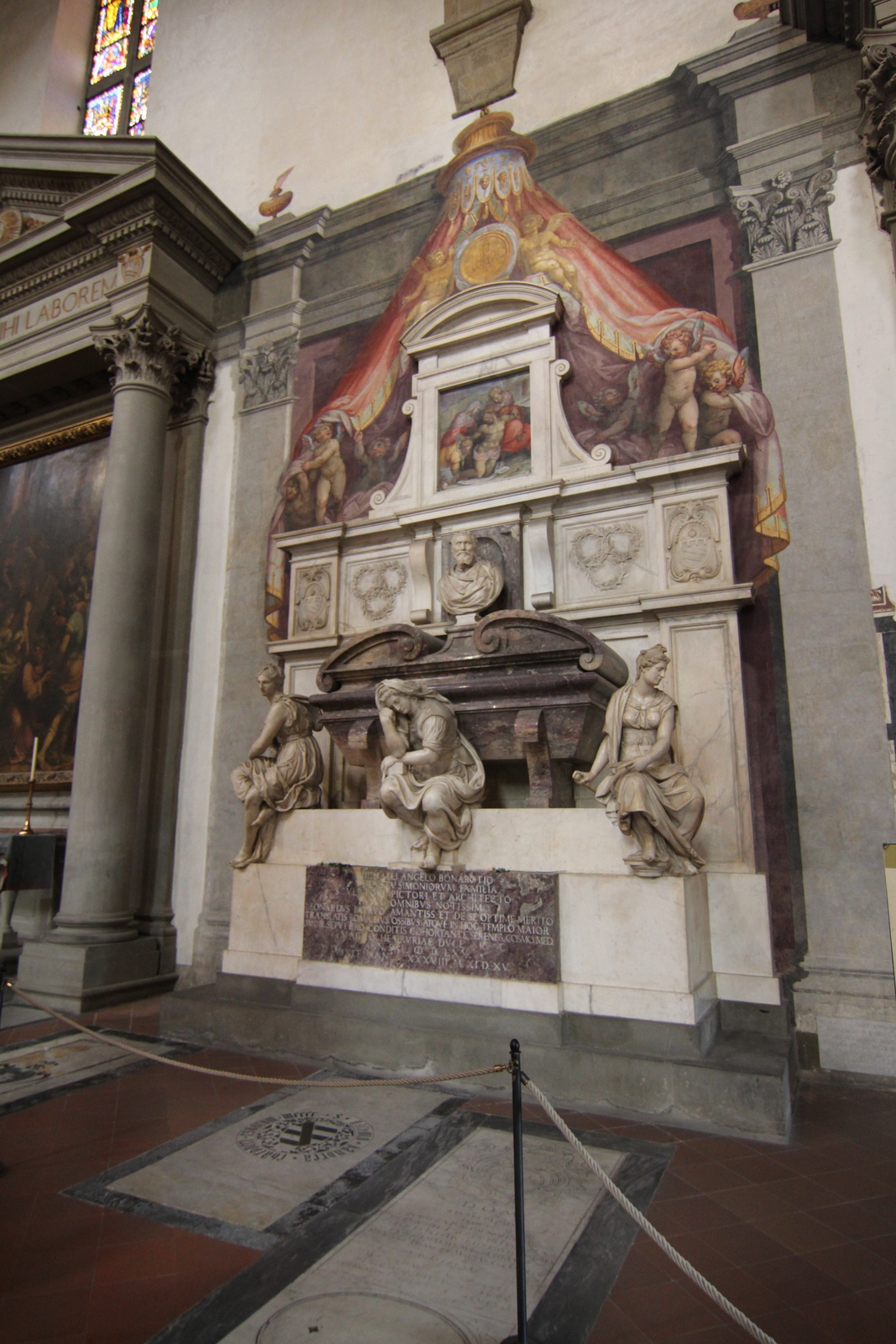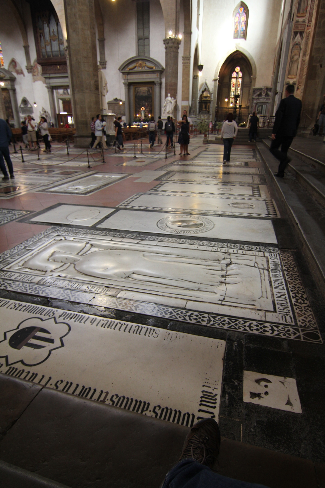 Ich habe aber noch zwei Stunden Zeit um Santa Croce zu besichtigen. Im Gegensatz zum Dom, muß ich hier für den Eintritt bezahlen. Ich habe mittlerweile die Hypothese, daß das Eintrittsgeld davon abhängt, wieviele Kunstschätze aus der betreffenden Kirche in eines der Museen der Stadt geschaffen wurden und wieviele noch in der Kirche zu sehen sind. In Santa Croce gibt es die Gräber mehrerer Berühmtheiten. Darunter Galileo, Michelangelo, Machiavelli und Rossini.