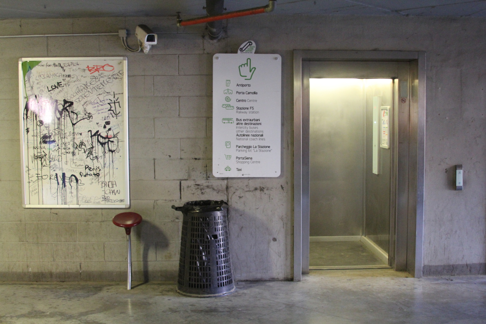 Es beginnt in Bahnhof von Siena. Der liegt zur Abwechslung mal etwas außerhalb des alten Stadtkerns. Es gibt eine Busverbindung, aber die muß man erstmal finden. Die Wegweiser sind spärlich angebracht, klein und weisen mal den Weg zum Bus zur Altstadt, mal zum Bahnhof und mal zum Einkaufszentrum, das man nach zwei Rolltreppen sowieso automatisch erreicht. Ich finde die Busstation schließlich im Keller beim Eingang zur Parkgarage. Ich habe selten eine so herunter gekommene Haltestelle gesehen wie diese hier. Stellt euch den Busbahnhof in Bergisch Gladbach vor. Den Keller eines der Treppenhäuser. Vor zwanzig Jahren.