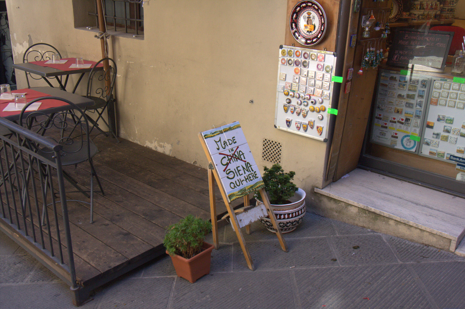 Auf dem berühmten zentralen Platz gibt es immer noch kein Zeichen der Tourist Information oder einer Stadtkarte. Also gehe ich erstmal weiter zum Dom. Den Weg kann ich wider nur erahnen. Ab und zu kann ich ja mal einen Teil der Kuppel über den Dächern aufragen sehen. Als ich den Dom erreiche finde ich auch endlich die Tourist Information. Eine Karte gibt es aber immer noch nicht. Vermutlich um die billigen Faltblätter mit Werbung, und einer Landkarte, zu verkaufen. Das alles habe ich noch in keiner anderen Stadt erlebt. Als ich dann auch noch sehe, daß ich auch hier erst herausfinden muß, welche Schlange zum Kartenverkauf, welche zur Reservierung und welche zum Einlass führt (zu was auch immer), habe ich die Nase voll und nehme den ersten Zug zurück nach Florenz. Ich bin nicht mal mehr bereit die 1,20 Euro für den Bus zu bezahlen und gehe die zwanzig Minuten lieber zu Fuß. Auf dem Weg finde ich noch ein Schild vor einem kleinen Laden auf dem steht „Made in China in Italy“. Wiederlich.